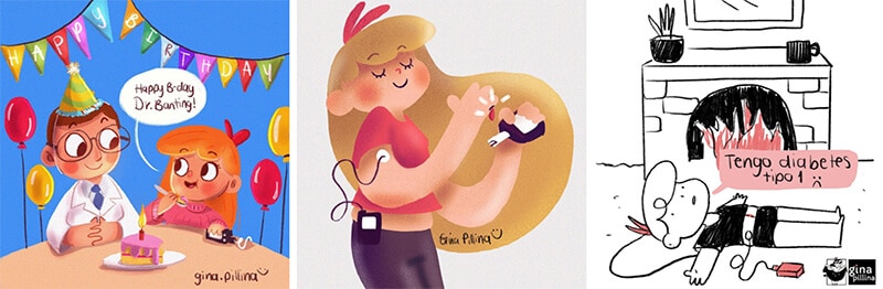 Gina is an illustrator and designer from Mexico. She studied graphic design and got a Master’s degree in 3D animation. She has been living with Type 1 diabetes since 2007. She loves expressing herself through her characters. Gina Pillina is the funny protagonist of her comic strips. Gina wanted to create a character with diabetes that could be beloved not only by the diabetes community, but also by people who are not familiar with diabetes.