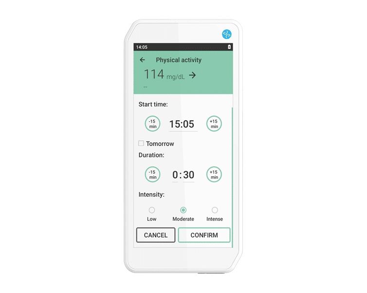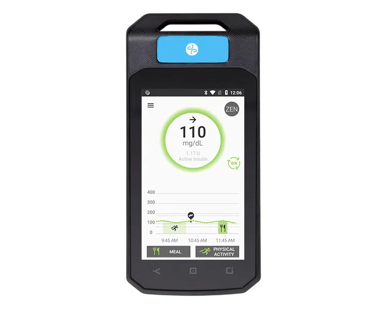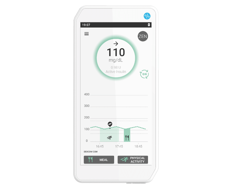 The DBLG1 analyzes the glucose data of a CGM (Continuous Glucose Monitoring) and calculates the right dose of insulin to administer through an insulin pump, while considering the patient’s physiology, history and data entries (meals or exercise), thus creating a hybrid closed-loop system.