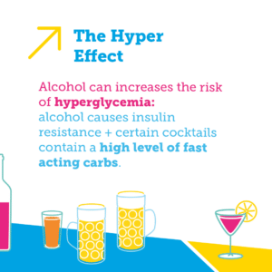 Alcohol also causes insulin resistance, which makes insulin less efficient. In addition, some mixed drinks (think screwdrivers, whisky coke, and cocktails with names as exotic as their ingredients are sweet) contain a high level of quickly digested carbohydrates. There is a very real risk of hyperglycemia in the short term! This is why it is not uncommon to have a series of episodes of hyperglycemia and hypoglycemia when consuming these types of drinks.