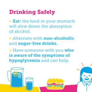 It is strongly recommended not to drink alone. When going out, make sure you are accompanied by someone who is aware of the symptoms of hypoglycemia and who is ready to help you if necessary. Caution: Signs of hypoglycemia can be confused with signs of drunkenness, which can lead to dangerous situations. It may be prudent to carry your medical identification card with you.