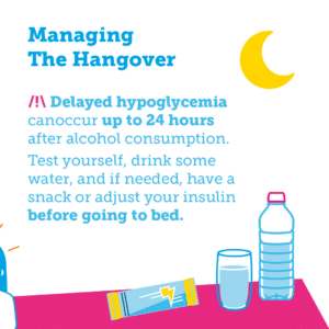 To avoid a painful morning – especially morning hypoglycemia – always remember to test your blood sugar before hitting the hay. Important reminder (especially if you are considering sleeping in): delayed hypoglycemia can occur up to 24 hours after alcohol consumption. If necessary, you can have a snack before going to sleep to prevent nocturnal hypoglycemia or adjust your insulin doses downward – after discussion with your doctor.