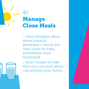 Lazy Sundays often mean brunch. Breakfast and lunch are then close together in time, sometimes even combined. A shorter time between these two meals means that morning prandial insulin can still be active at the time of your lunchtime injection.
